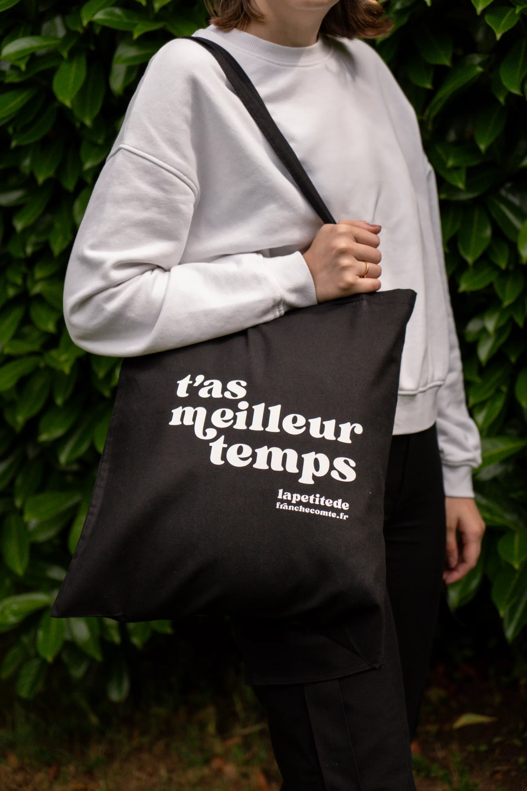 Tote-bag exclusif « T’as meilleur temps » fait en Franche-Comté. Les délais de création sont de 5 à 8 jours ouvrés (parfois moins !). Les couleurs et le positionnement de la typographie peuvent varier selon le façonnage car ils sont marqués entièrement à la main. Le tote-bag est lavable. Il est conseillé de le laver à la main et le sécher à l’envers pour éviter d’abimer le motif. Repassage possible, application du fer uniquement sur l’envers.