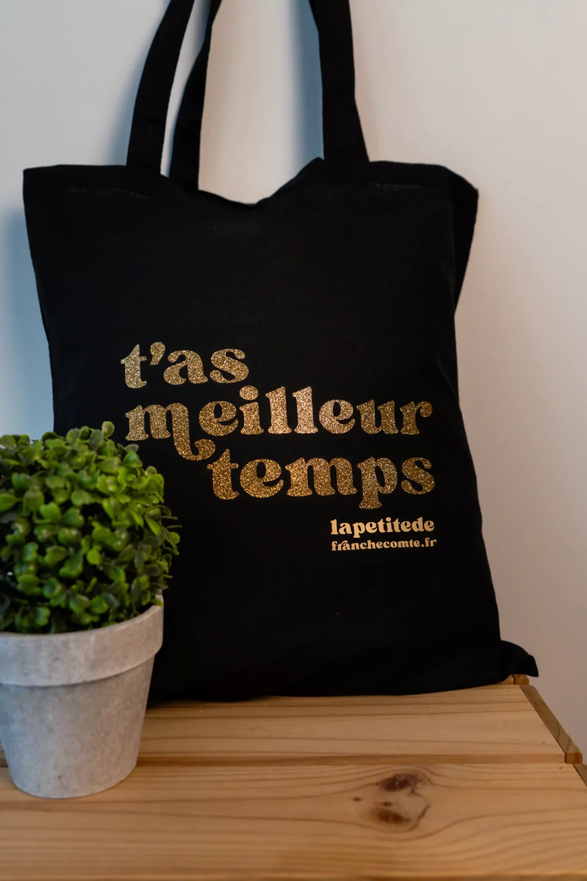 Tote-bag exclusif « T’as meilleur temps » fait en Franche-Comté. Les délais de création sont de 5 à 8 jours ouvrés (parfois moins !). Les couleurs et le positionnement de la typographie peuvent varier selon le façonnage car ils sont marqués entièrement à la main. Le tote-bag est lavable. Il est conseillé de le laver à la main et le sécher à l’envers pour éviter d’abimer le motif. Repassage possible, application du fer uniquement sur l’envers.