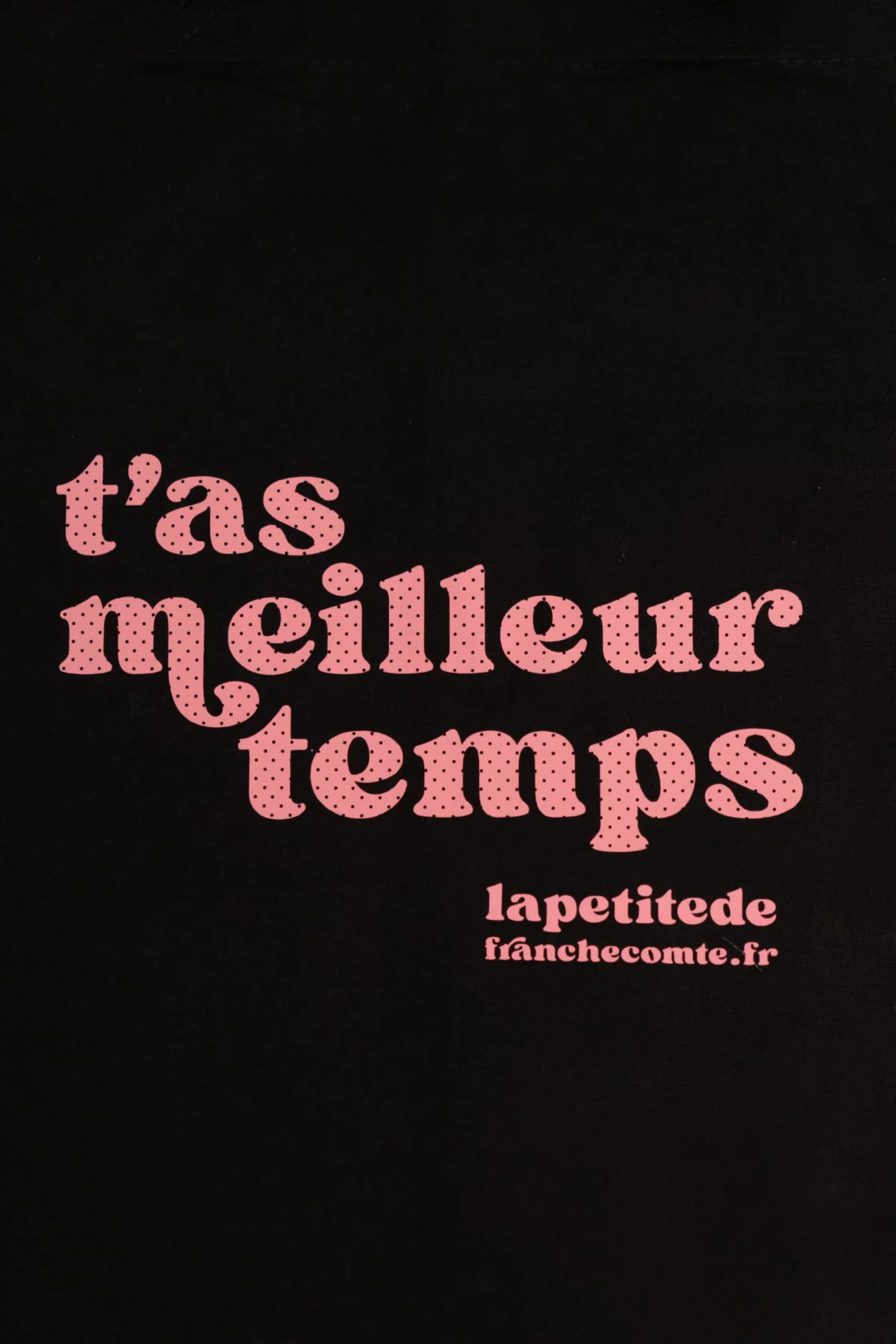 Tote-bag exclusif « T’as meilleur temps » fait en Franche-Comté. Les délais de création sont de 5 à 8 jours ouvrés (parfois moins !). Les couleurs et le positionnement de la typographie peuvent varier selon le façonnage car ils sont marqués entièrement à la main. Le tote-bag est lavable. Il est conseillé de le laver à la main et le sécher à l’envers pour éviter d’abimer le motif. Repassage possible, application du fer uniquement sur l’envers.