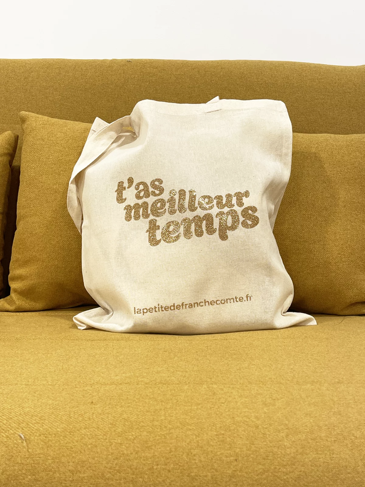 Tote bag fait sur demande en Franche-Comté. Les délais de création sont de 3 jours ouvrés (parfois moins !). Ce tote bag unique porte l’expression emblématique franc-comtoise « T’as meilleur temps », qui apportera une touche d’authenticité à vos balades. Les couleurs et le positionnement de la typographie peuvent varier selon le façonnage car ils sont marqués entièrement à la main. Le Tote bag est lavable. Il est conseillé de le laver et le sécher à l’envers pour éviter d’abimer le motif. Repassage possible, application du fer uniquement sur l’envers. « T’as meilleur temps » : Expression franc-comtoise qui veut dire : « Tu ferais mieux de… »