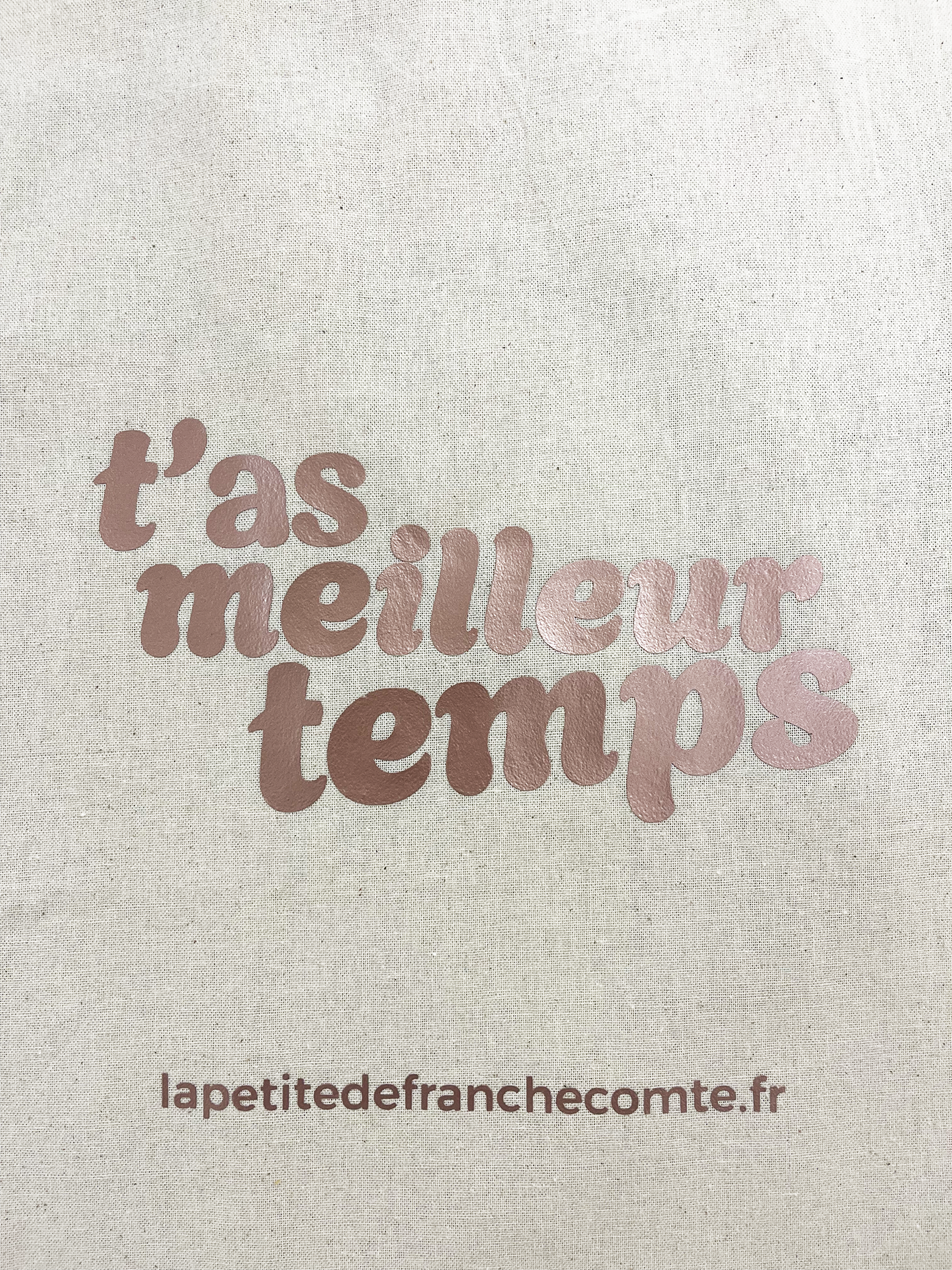 Tote bag fait sur demande en Franche-Comté. Les délais de création sont de 3 jours ouvrés (parfois moins !). Ce tote bag unique porte l’expression emblématique franc-comtoise « T’as meilleur temps », qui apportera une touche d’authenticité à vos balades. Les couleurs et le positionnement de la typographie peuvent varier selon le façonnage car ils sont marqués entièrement à la main. Le Tote bag est lavable. Il est conseillé de le laver à la main et le sécher à l’envers pour éviter d’abimer le motif. Repassage possible, application du fer uniquement sur l’envers. « T’as meilleur temps » : Expression franc-comtoise qui veut dire : « Tu ferais mieux de… »