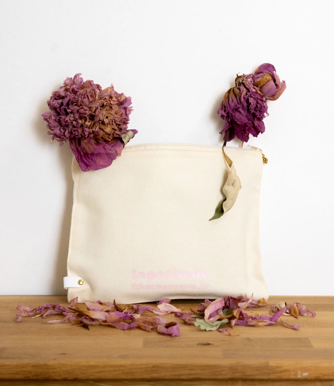 Pochette ou trousse exclusive « La vie est belle en Franche-Comté » créée en Franche-Comté. Trousse en tissu de couleur beige avec fermeture éclair de couleur beige, personnalisée sur demande, en Franche-Comté.